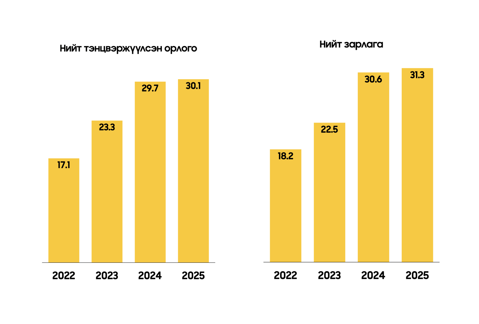 Тэнцвэржүүлсэн орлого ₮30.1 их наяд болж 1.3%-р өссөн ч төсвийн зарлага ₮31.3 их наяд хүрч алдагдлын гол шалтгаан болжээ.