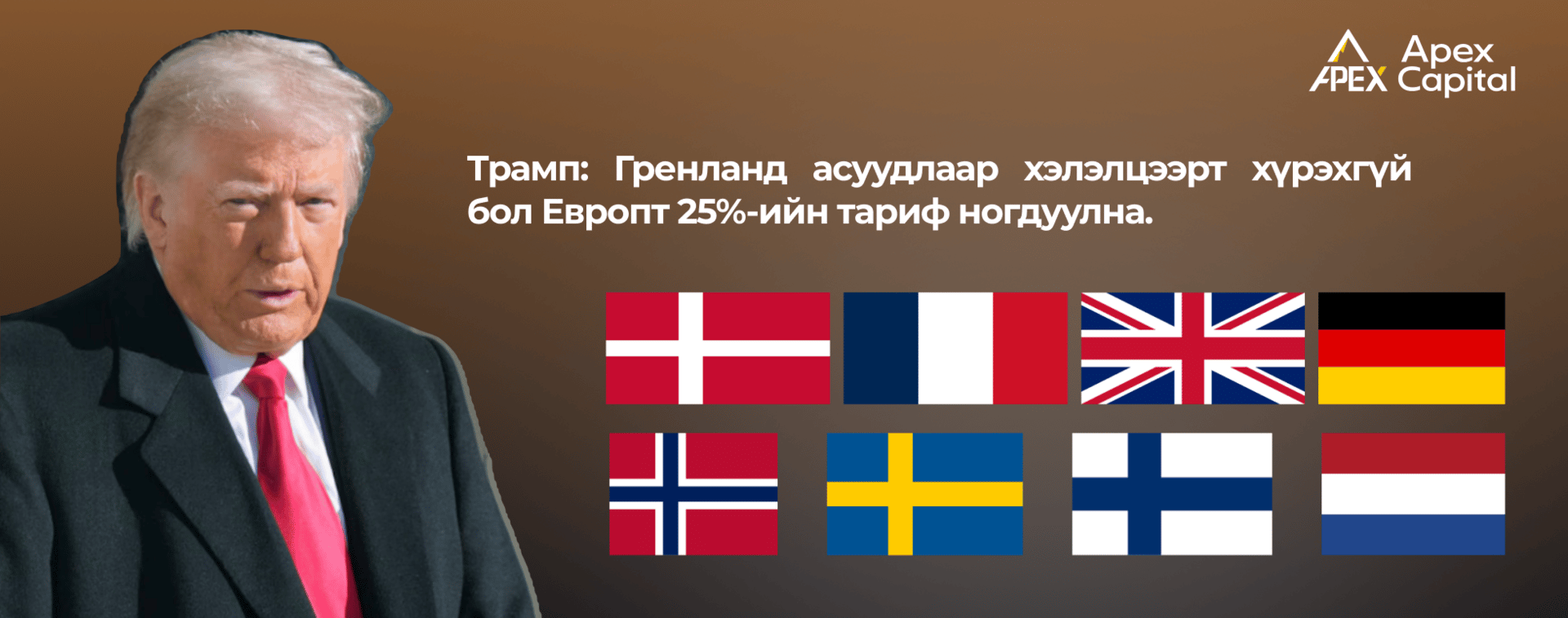 🔔Өнгөрсөн амралтын өдөр Ерөнхийлөгч Доналд Трамп Европын зарим улсад 10%-ийн худалдааны тариф ногдуулж, хэрэв Гренландтай холбоотой тодорхой хэлэлцээрт хүрч чадахгүй бол 6 сарын 1-нээс уг тарифыг 25% хүртэл нэмэгдүүлнэ гэж мэдэгдлээ.